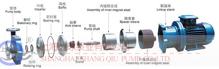 驅動裝置采用主動磁鐵聯軸器直接裝在電機軸上,泵室完全封閉,通過磁力偶合間接驅動轉子組合上的葉輪旋轉。