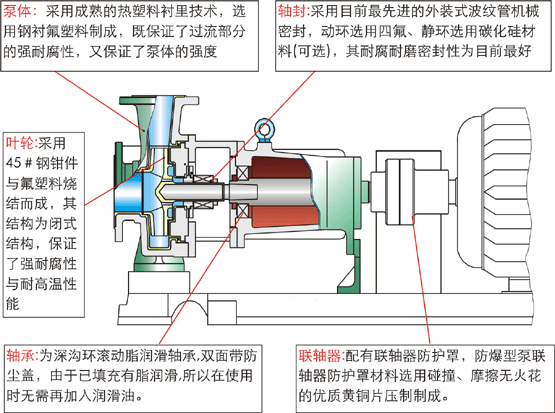 該泵具有耐腐、耐磨、耐高溫、不老化、機(jī)械強(qiáng)度高、運(yùn)轉(zhuǎn)平穩(wěn)、結(jié)構(gòu)先進(jìn)合理、密封性能嚴(yán)格可靠、拆卸檢修方便、使用壽命長等優(yōu)點(diǎn),廣泛適用于化工、制藥、石油、冶金、冶煉、電力、電鍍、染料、農(nóng)藥、造紙、食品、紡織等行業(yè),在-85℃~200℃溫度條件下長期輸送任意濃度的硫酸、鹽酸、氫氟酸、硝酸、王水、強(qiáng)堿、強(qiáng)氧化劑、有機(jī)溶劑、還原劑等強(qiáng)腐蝕介質(zhì),是目前世界是最耐腐蝕設(shè)備之一。