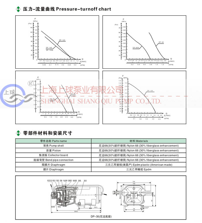 2.裝有隨泵附帶的進出口接頭,DP-130 DP-125 DP-100 DP-60型隔膜泵進出口采用ZG3/8″外牙G29/64″彎管接頭;DP-35隔膜泵進出口采用3/8″外牙軟管接頭.