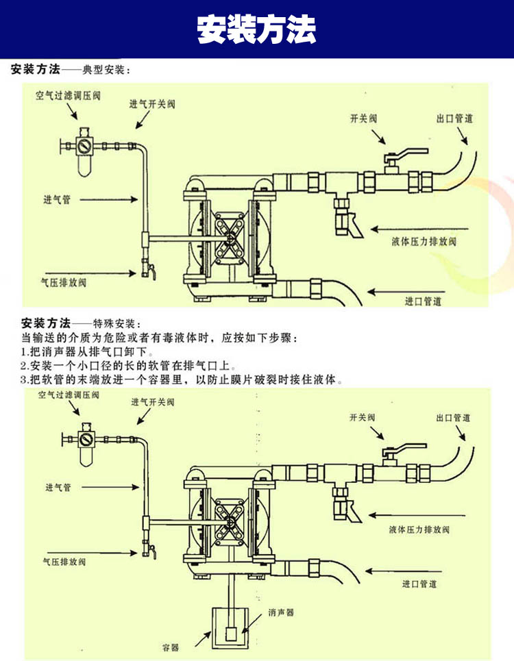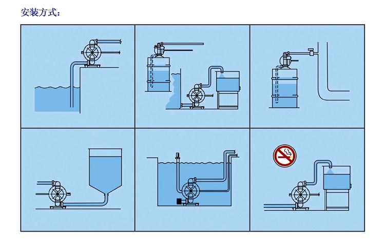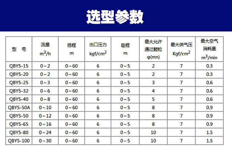 3、揚程、流量可通過氣源壓力來調(diào)節(jié)。(氣壓壓力在0.1-0.84Mpa之間)