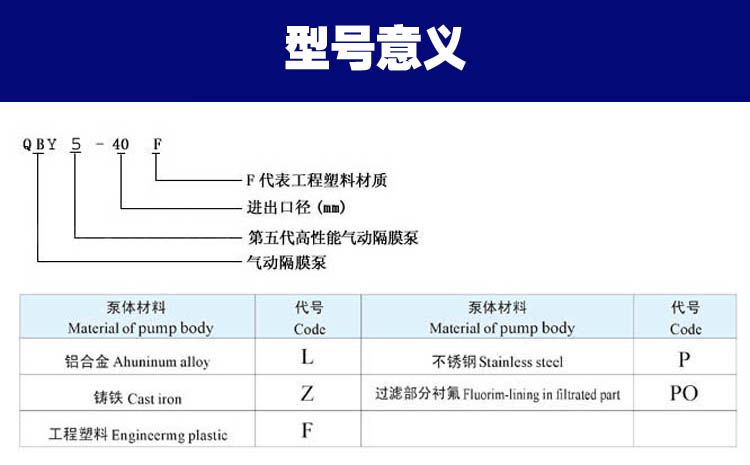 生產(chǎn)的隔膜泵共有十二種規(guī)格。進出口尺寸分別為1/4”(10mm)、1/2”(15mm)、3/4”(20mm)、1”(25mm)、1.2”(32mm)1.5”(40mm)、2”(50mm)、2.5”(65mm)3”(80mm)、4”(100mm)流體部件材質(zhì)有:鋁合金、鑄鐵、聚丙烯、不銹鋼、隔膜根據(jù)不同膜片材質(zhì)分別有:丁晴橡膠、氯丁橡膠、聚乙烯、聚膠、聚醚橡膠、氟橡膠、氟塑料、特氟隆。以滿足不同液體介質(zhì)的需要。