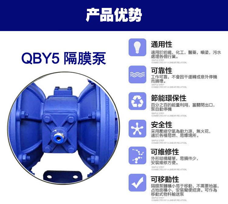 具有使用壽命長、永不停機、無需加油的優(yōu)點,即能抽送流動的液體,又能輸送一些不易流動的介質(zhì),具有自吸泵、潛水泵、屏蔽泵、泥漿泵和雜質(zhì)泵等輸送機械的許多優(yōu)點。生產(chǎn)的QBY5系列氣動隔膜泵是一種新型的輸送設(shè)備,是目前國內(nèi)最新穎的泵類。采用壓縮空氣為動力源,對于各種腐蝕性液體,帶顆粒的液體,高粘度、易揮發(fā)、易燃、劇毒的液體,均能抽光吸盡。