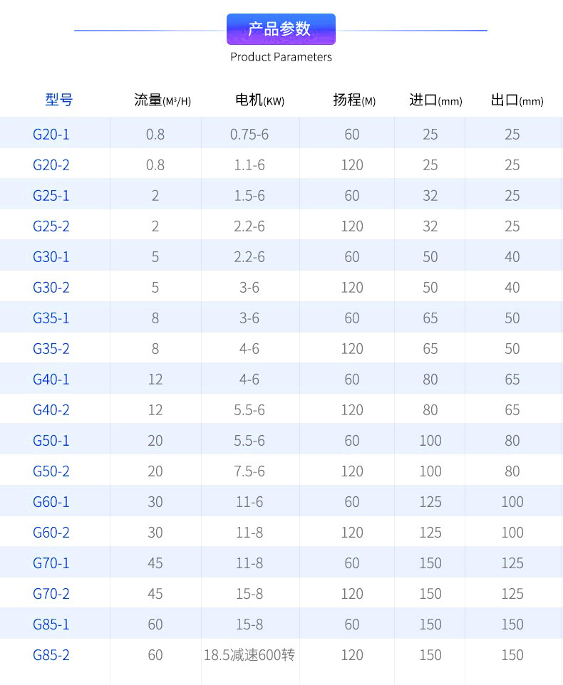 G系列單螺桿泵選型參數:
